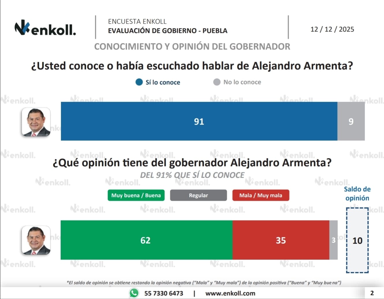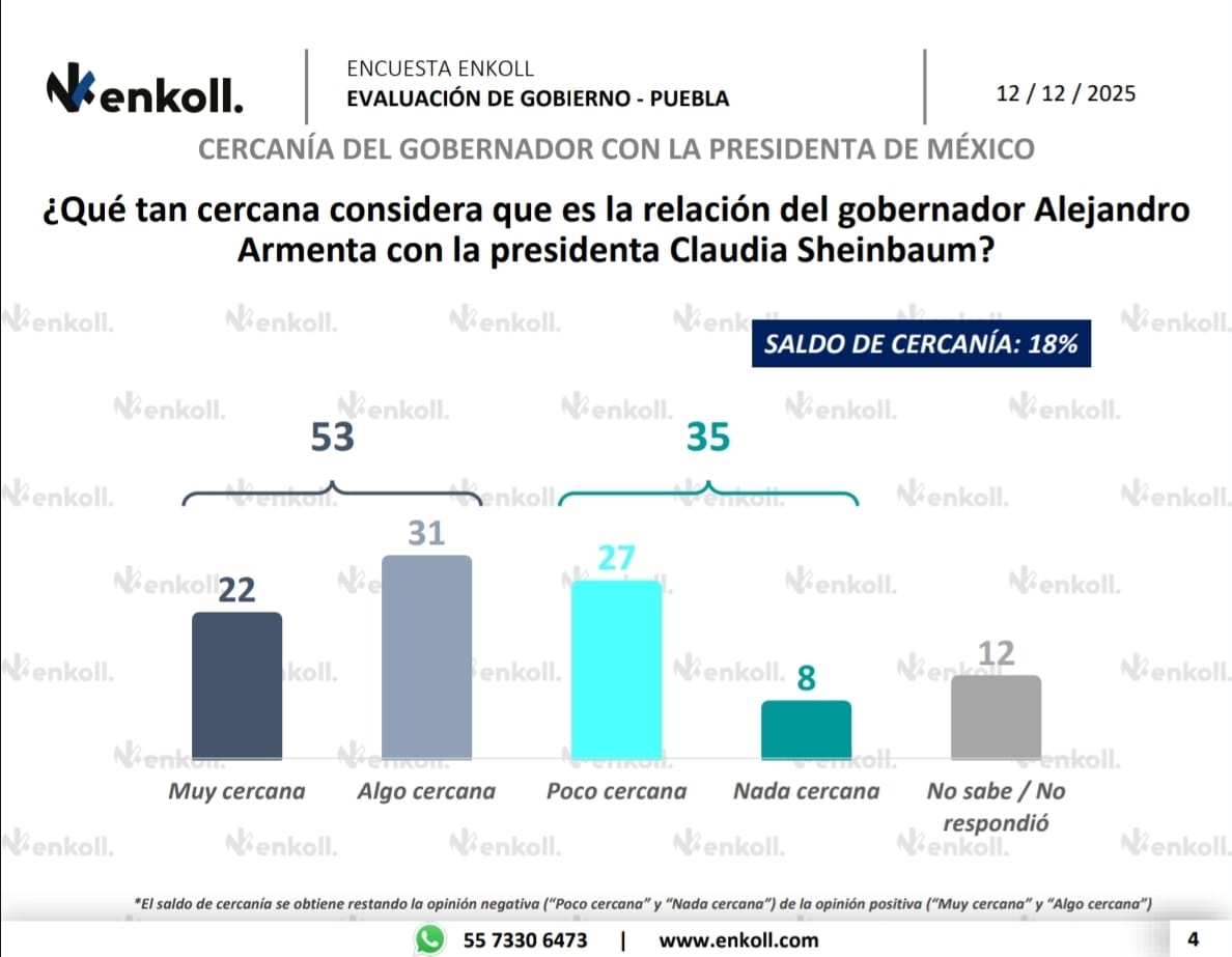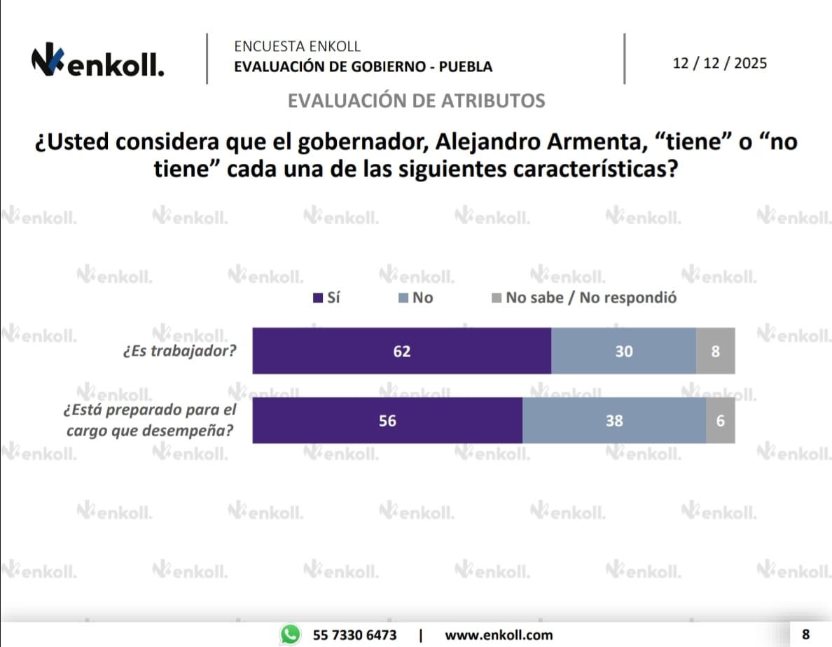 El gobernador de Puebla, Alejandro Armenta, registra un alto nivel de conocimiento y una amplia aprobación ciudadana, además de ser percibido mayoritariamente como un mandatario trabajador, de acuerdo con la evaluación más reciente de la casa encuestadora Enkoll, publicada por El Universal.