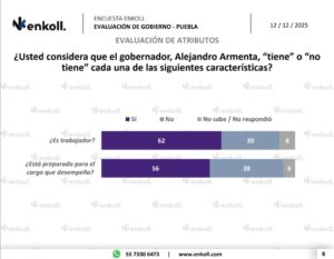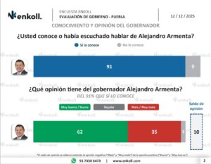 En cuanto al desempeño gubernamental, la evaluación muestra que 60 por ciento aprueba el trabajo de Armenta en su primer año de gestión. La encuesta planteó de forma directa: “Pensando en este primer año de gobierno, ¿usted ‘aprueba’ o ‘desaprueba’ el trabajo que está realizando Alejandro Armenta como gobernador de Puebla?”, donde las respuestas de aprobación se ubicaron claramente por encima de la desaprobación.
