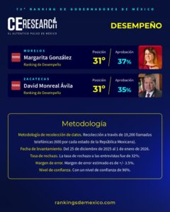 En contraste, las últimas posiciones del ranking muestran pocos cambios respecto a las mediciones anteriores. David Monreal, gobernador de Zacatecas, volvió a colocarse como el peor evaluado del país, acompañado en el fondo de la tabla por Margarita González (Morelos, 31°), Alfredo Ramírez Bedolla (Michoacán, 30°), Rocío Nahle (Veracruz, 29°) y Salomón Jara (Oaxaca, 28°) .