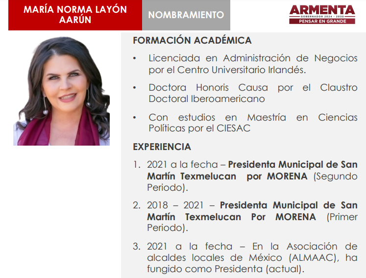 Mientras que la Secretaría de Turismo la presidirá Norma Layón, quien en la actualidad es presidenta municipal de San Martín Texmelucan por Morena, en su segundo periodo, es presidenta de la Asociación de alcaldes locales de México y cuenta con maestría en Ciencias Políticas por el CIESAC.