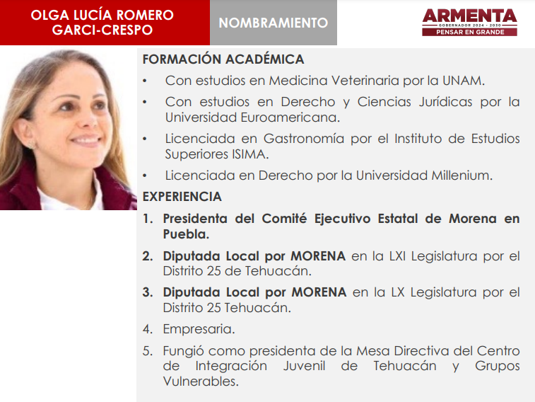 Para la dirección de Carreteras de Cuota Puebla, definió a Olga Lucía Romero Garci-Crespo, quien es presidenta estatal de Morena y cuenta con estudios en Medicina Veterinaria, Derecho y Ciencias Jurídicas, así como Gastronomía.