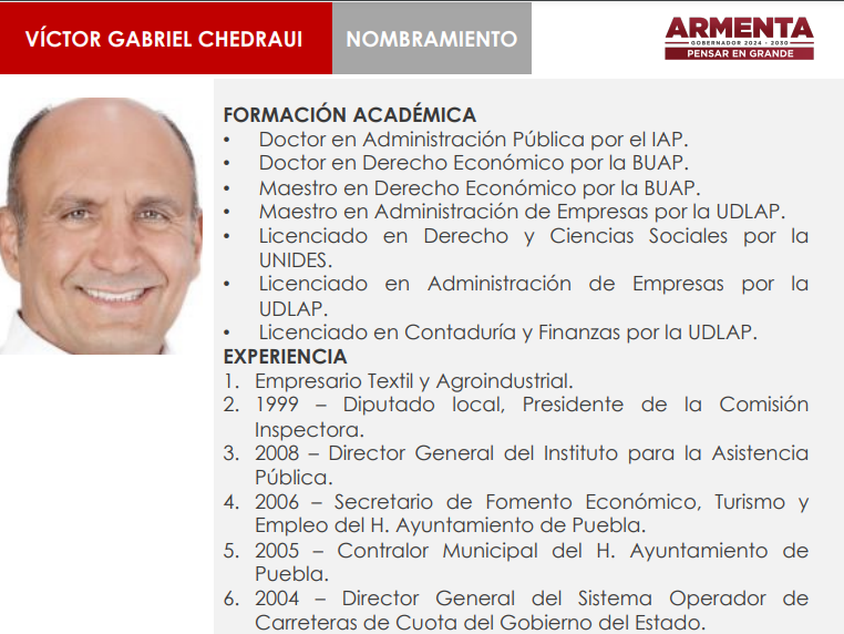 La Secretaría de Economía y Trabajo será encabezada por Víctor Gabriel Chedraui, quien cuenta con doctorados en Administración Pública y en Derecho Económico.
