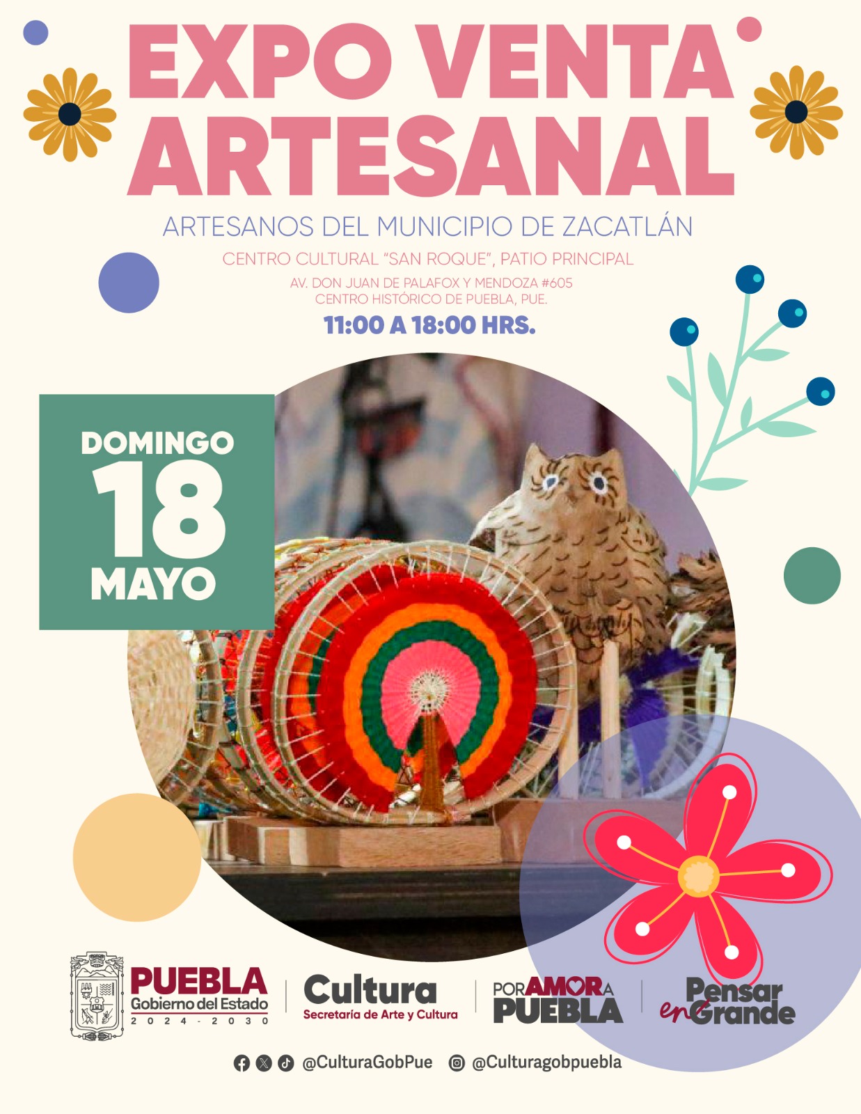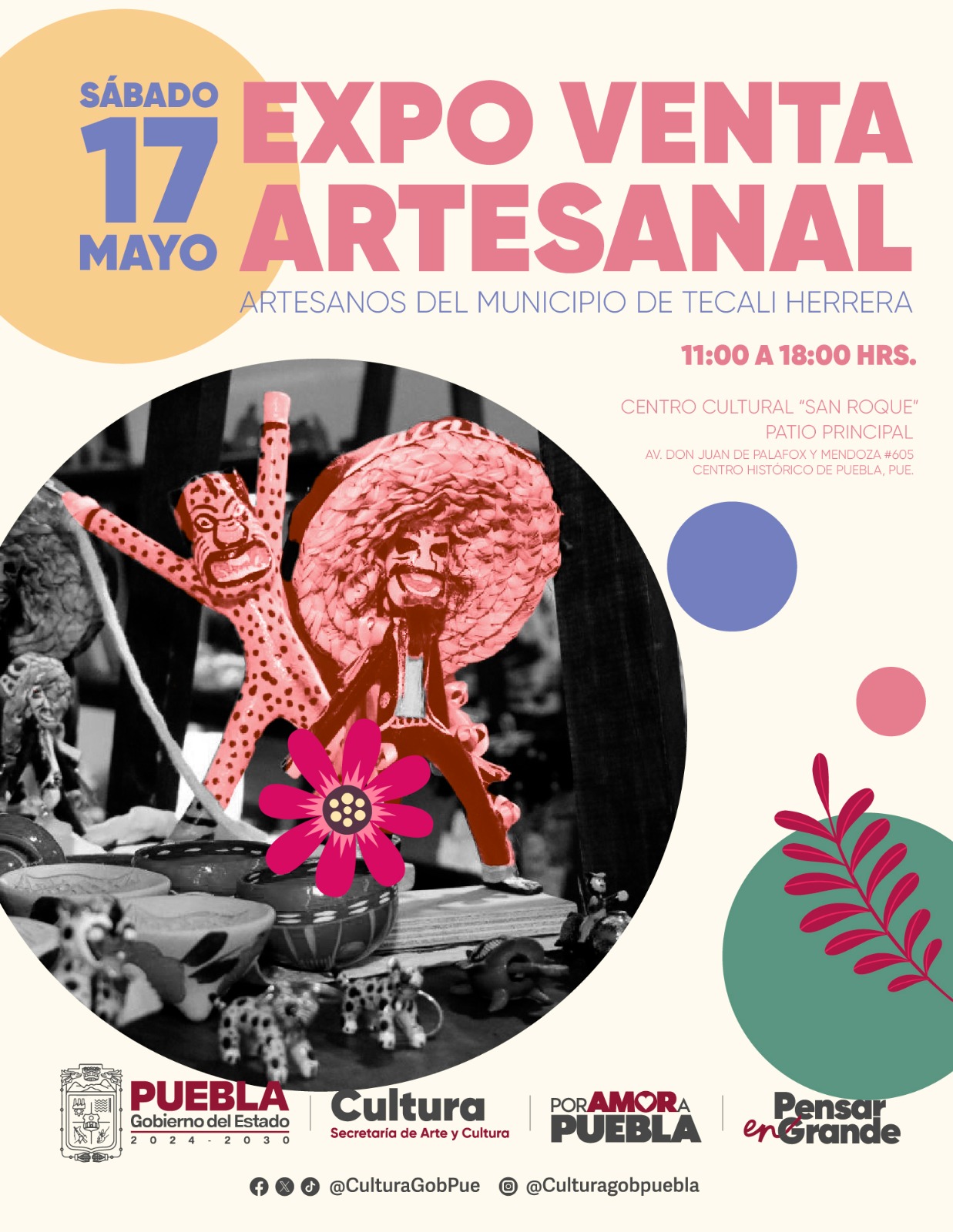 CIUDAD DE PUEBLA, Pue.- El Centro Cultural “San Roque” albergará expo ventas artesanales de municipios poblanos, impulsadas por el Gobierno del Estado de Puebla que encabeza Alejandro Armenta, a través de la Secretaría de Arte y Cultura. Este 17 de mayo acudirán artesanas y artesanos de Tecali de Herrera, mientras que el día 18 serán productores provenientes de Zacatlán, en horario de 10:00 a 18:00 horas.