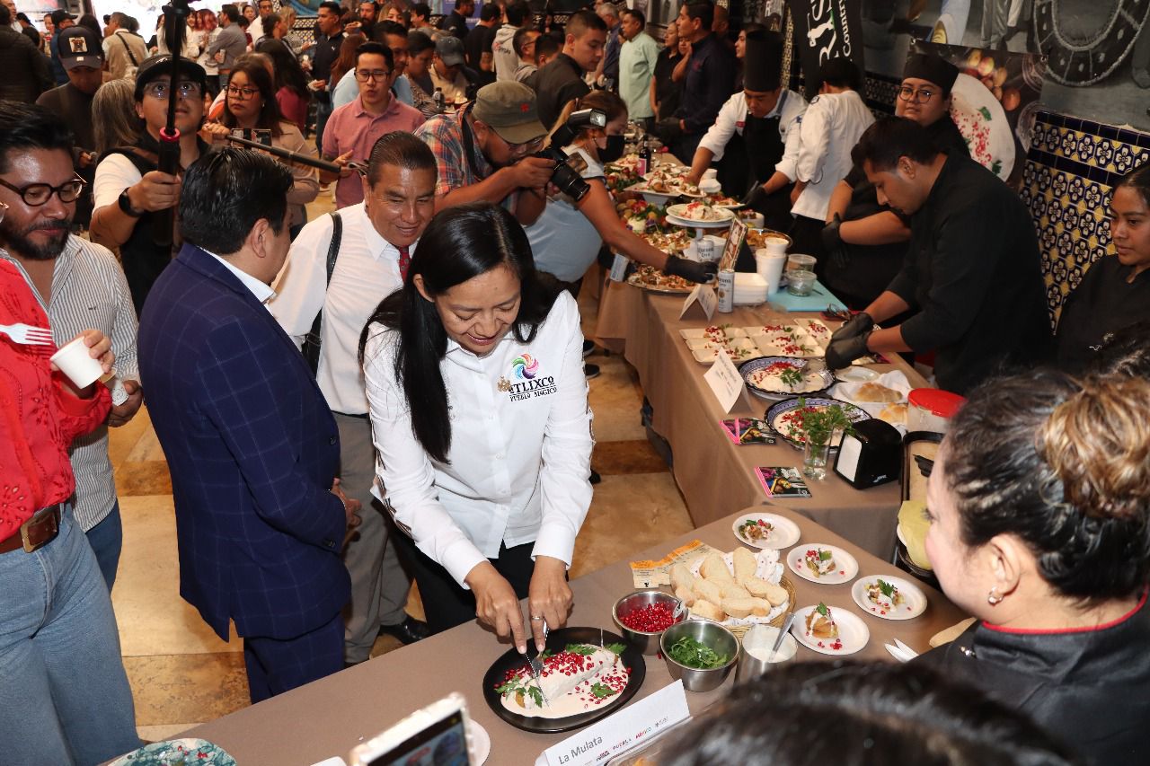 La presidenta de Atlixco, Ariadna Ayala, acompañada de José Juan Sánchez Martínez, presidente de la CANIRAC y Laura Huerta, representante de la CANIRAC Atlixco, presentaron la Ruta del Chile en Nogada 2025.