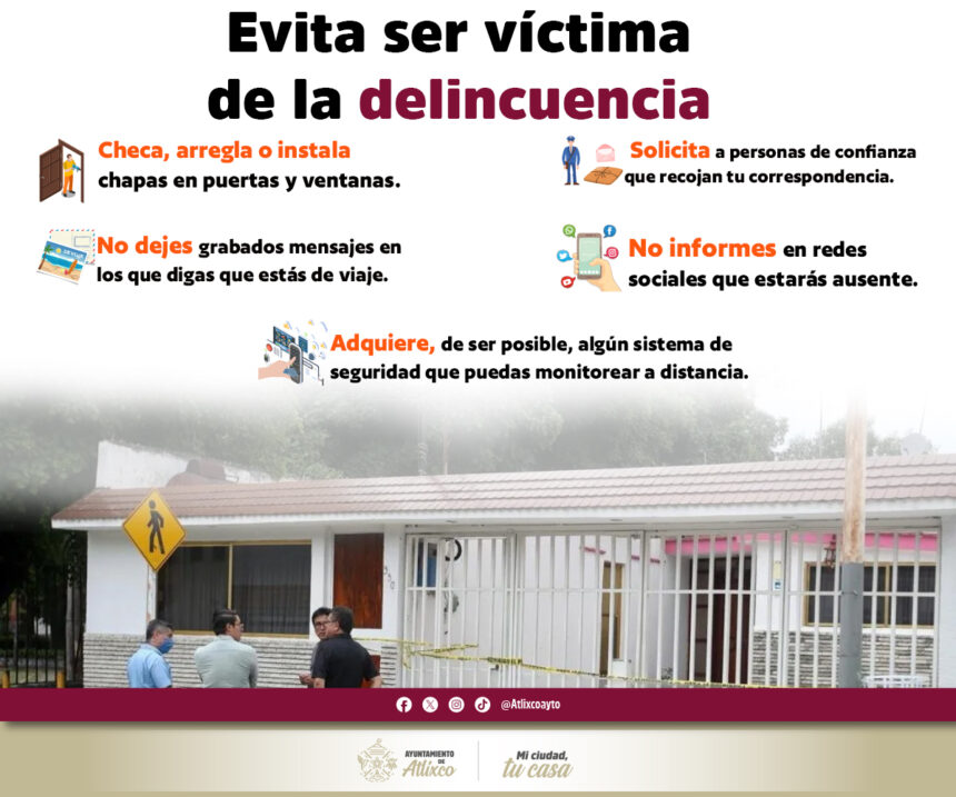 Con motivo del periodo vacacional de Semana Santa, muchas familias aprovechan para salir de la ciudad. Ante esto, la Secretaría de Seguridad Ciudadana de Atlixco exhorta a la población a tomar medidas preventivas para proteger su hogar y evitar ser blanco de la delincuencia.
