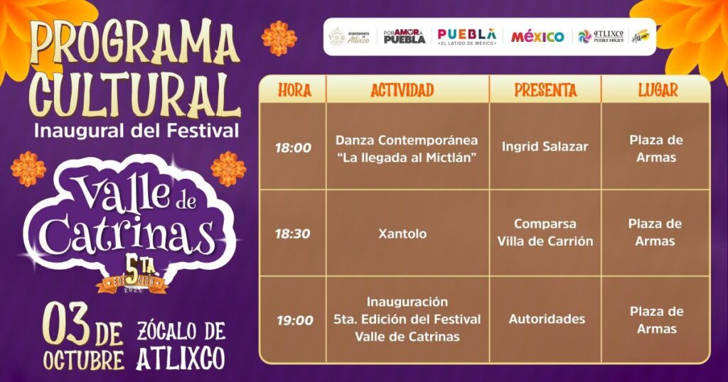 Ariadna Ayala, presidenta de Atlixco, invita a familias y visitantes a la inauguración de la 5ª edición del Festival Internacional Valle de Catrinas este viernes 3 de octubre a las siete de la tarde en el Zócalo.