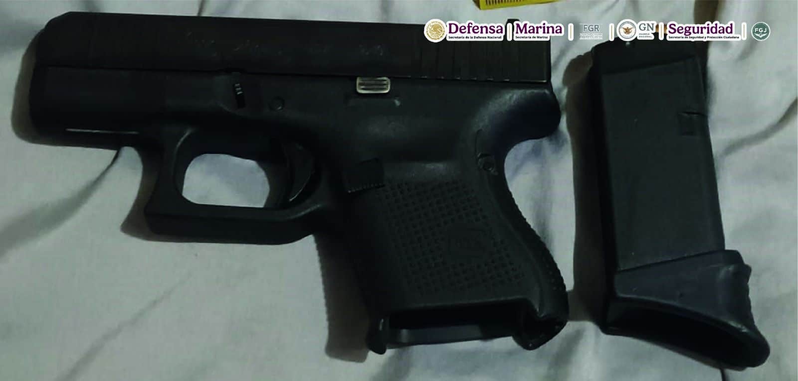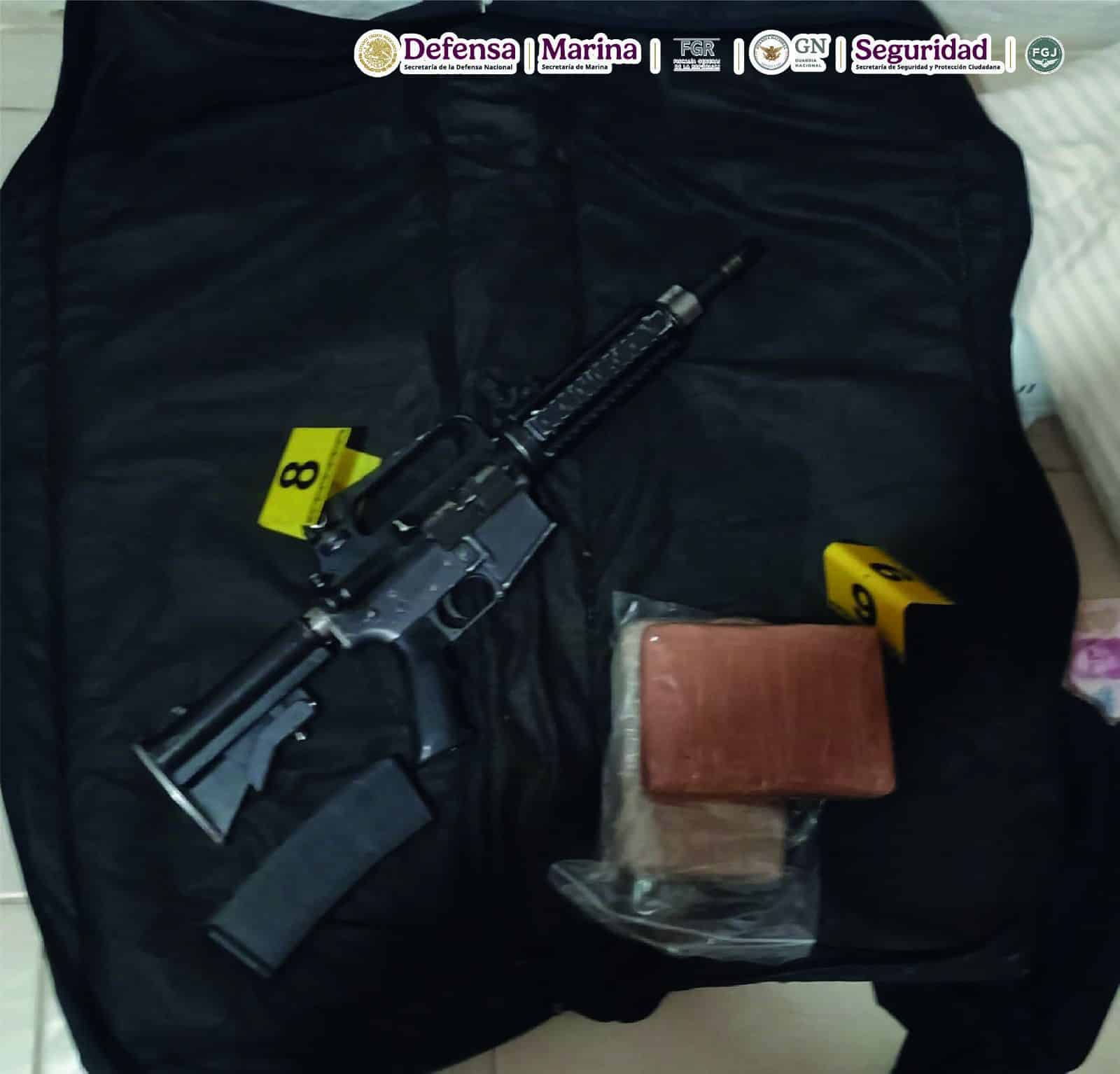 También fue detenida Yolanda V., quien se encontraba en el domicilio, donde se aseguró un arma larga y una corta, dos paquetes con aparente cocaína y equipos telefónicos.