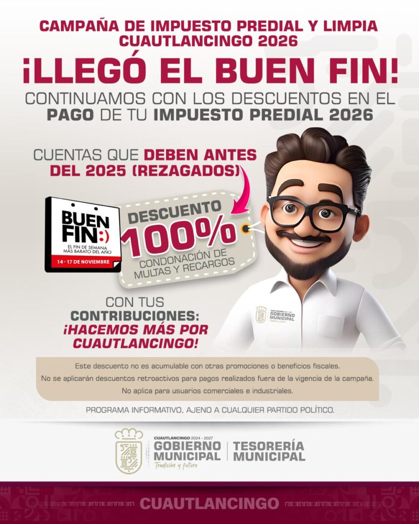 Con el objetivo de apoyar la economía de las familias en Cuautlancingo, el gobierno municipal informa los descuentos que se aplicarán en el pago del impuesto predial y de limpia desde el 14 de noviembre de 2025 hasta el 30 de abril de 2026.