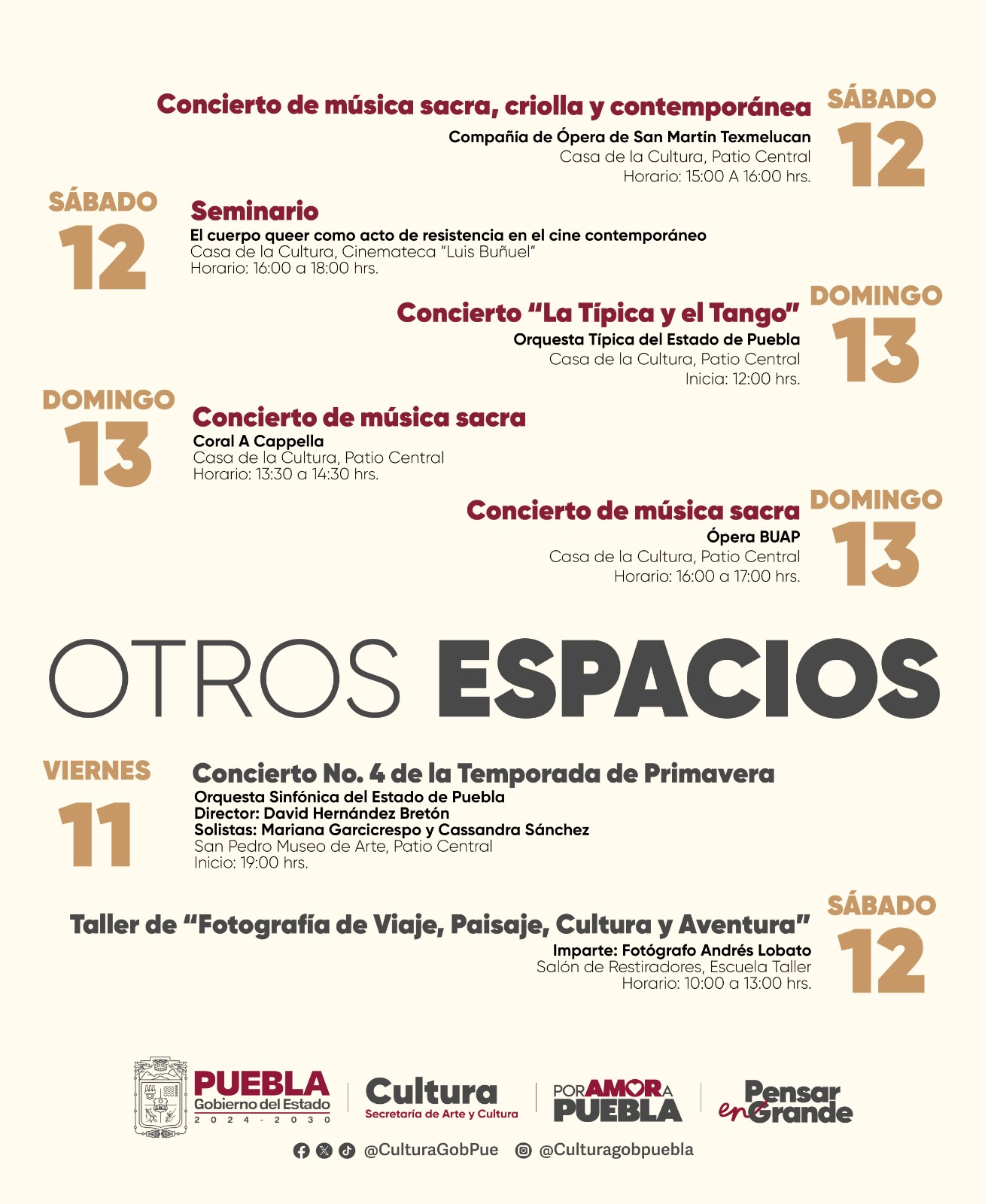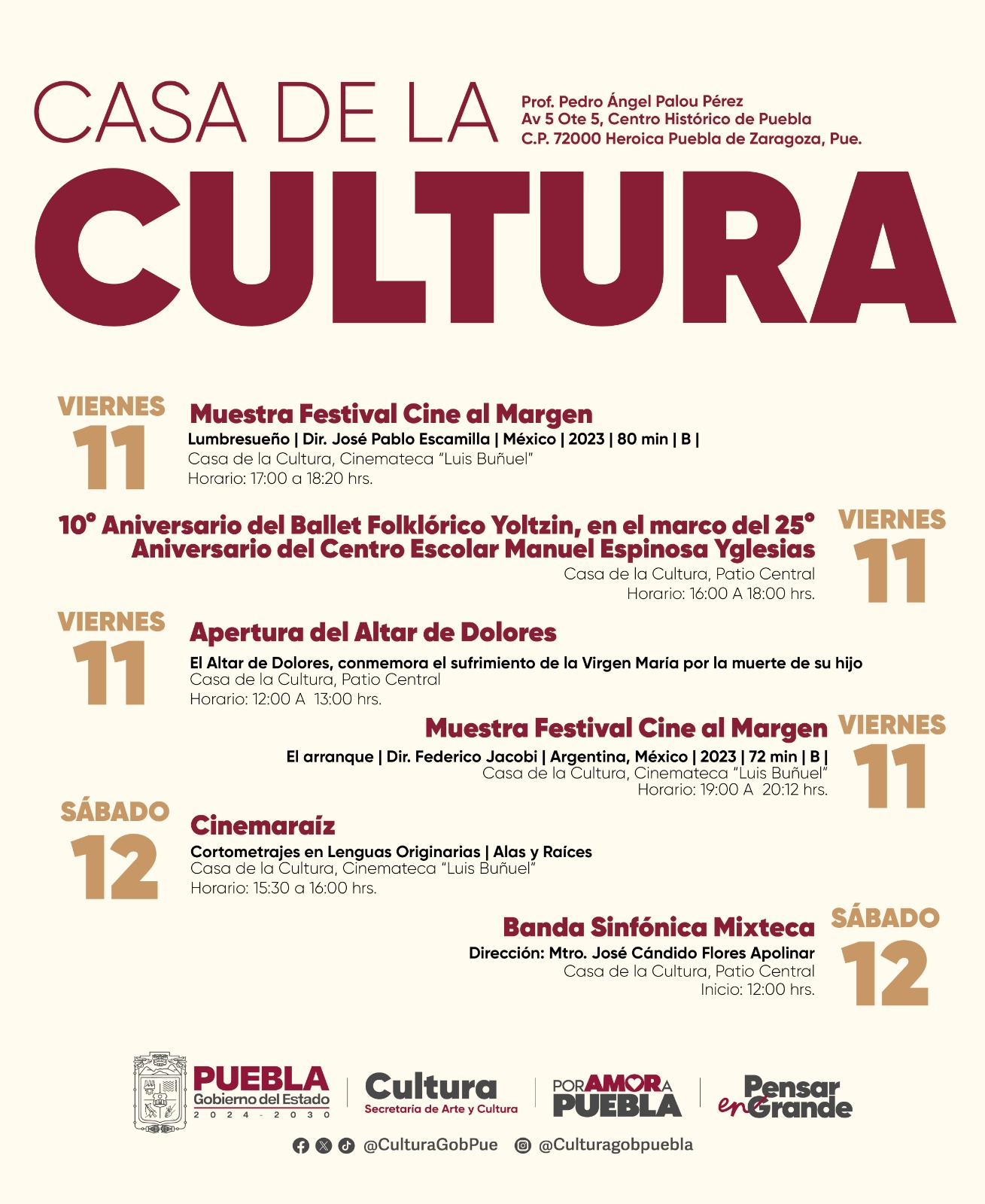 La programación completa está disponible en las redes sociales oficiales de la Secretaría de Arte y Cultura. La ciudadanía está invitada a disfrutar de estas actividades que promueven el arte, el patrimonio y la identidad cultural del estado.