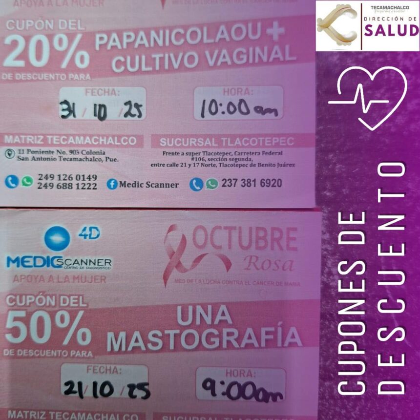 Los cupones contemplan 20% de descuento en Papanicolaou y cultivo vaginal, así como 50% en mastografía. Esta iniciativa busca fomentar la prevención y detección oportuna del cáncer de mama en el marco del “Octubre Rosa”.