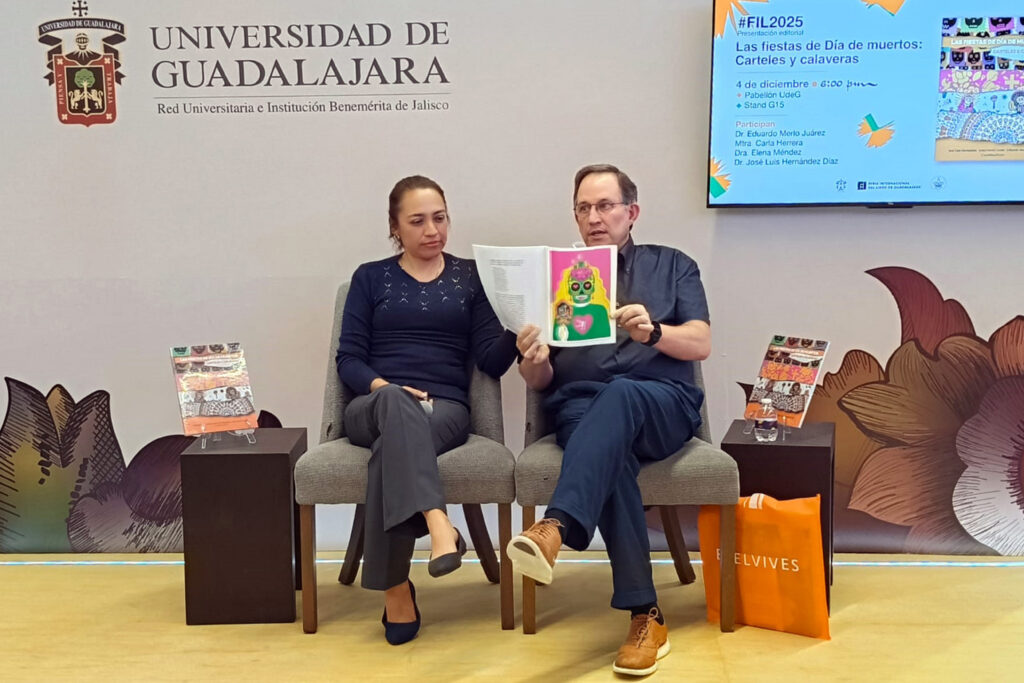 En el caso del libro Las fiestas de Día de Muertos: Carteles y calaveras, presentado el pasado jueves 4 de diciembre en el pabellón de la UDG, se trata de una obra coordinada por Eduardo Merlo, José Luis Hernández Díaz y Jorge David Cortés Moreno, la cual fue presentada por el escritor Pedro Ángel Palou y Julissa Hernández Gordillo.