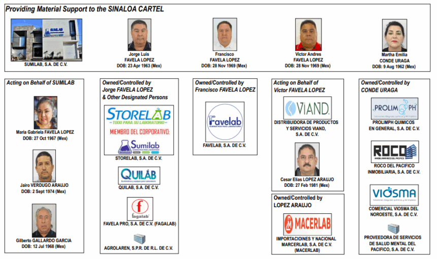 La familia Favela López es propietaria de Sumilab, empresa con sede en Culiacán dedicada a la venta de equipos y reactivos de laboratorio, que ya había sido sancionada por la OFAC en mayo de 2023. Pese a ello, el Tesoro estadounidense indicó que el grupo familiar “cambió de táctica y retiró la señalización de sus establecimientos, pero continuó participando en el suministro de precursores químicos” al Cártel de Sinaloa.
