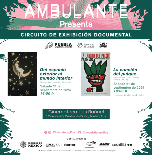 La programación continuará el sábado 21 de septiembre con la compilación de cortometrajes “Del espacio exterior al mundo interior”, a las 16:00 horas y, la cinta “La canción del pulque”, a las 19:00 horas. Esta última función contará con la presencia de su realizador, Everardo González.