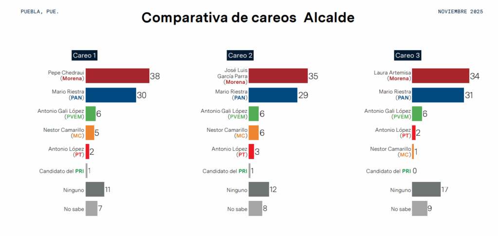 En los escenarios de competencia directa (“careos”), Morena mantiene la delantera. Cuando García Parra se enfrenta a Mario Riestra (PAN), Antonio Gali López (PVEM), Néstor Camarillo (MC) y otros contendientes, el morenista obtiene 35% de intención de voto, mientras que Riestra logra 29%. Con Laura Artemisa Chávez como candidata, Morena conserva el liderazgo con 34%, apenas tres puntos arriba del panista (31%), lo que confirma una ventaja sostenida del partido guinda sobre la oposición.
