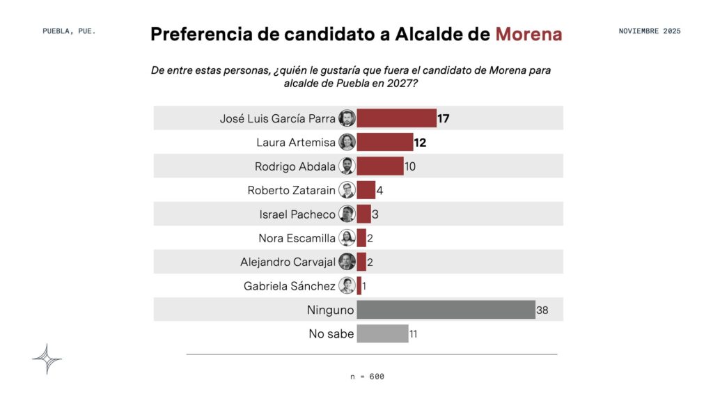 A casi dos años de la contienda municipal, Morena se posiciona como la fuerza política con mayor respaldo en la capital poblana. De acuerdo con la más reciente medición de la casa encuestadora Áltica (noviembre de 2025), los posibles abanderados de ese partido se colocan al frente en las preferencias rumbo a la alcaldía de Puebla 2027.