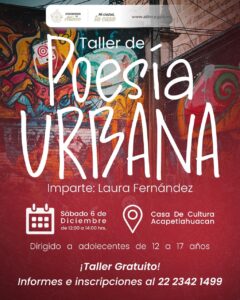 Como parte de las actividades, también este sábado 6 de diciembre se ofrecerá un Taller Gratuito de Poesía Urbana impartido por Laura Fernández, de 12:00 a 14:00 horas, en la Casa de Cultura Acapetlahuacan, dirigido a jóvenes de 12 a 17 años.