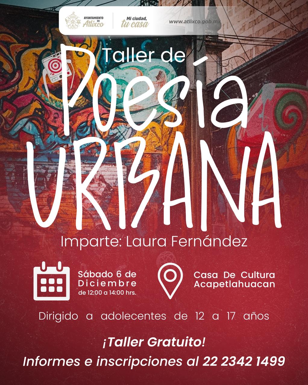 Como parte de las actividades, también este sábado 6 de diciembre se ofrecerá un Taller Gratuito de Poesía Urbana impartido por Laura Fernández, de 12:00 a 14:00 horas, en la Casa de Cultura Acapetlahuacan, dirigido a jóvenes de 12 a 17 años.