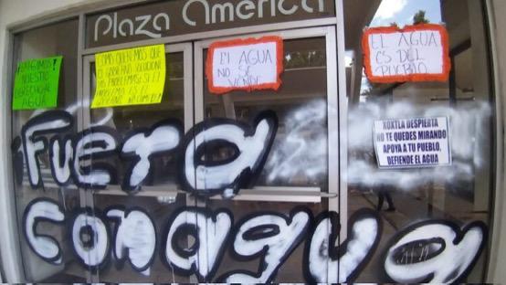 La protesta escaló. Miembros de la Unión de Pueblos y Fraccionamientos Contra el Basurero de Cholula llegaron también a Plaza América, donde dejaron huella con pintas y bloqueos que impidieron la entrada a quienes nada tenían que ver con sus demandas.