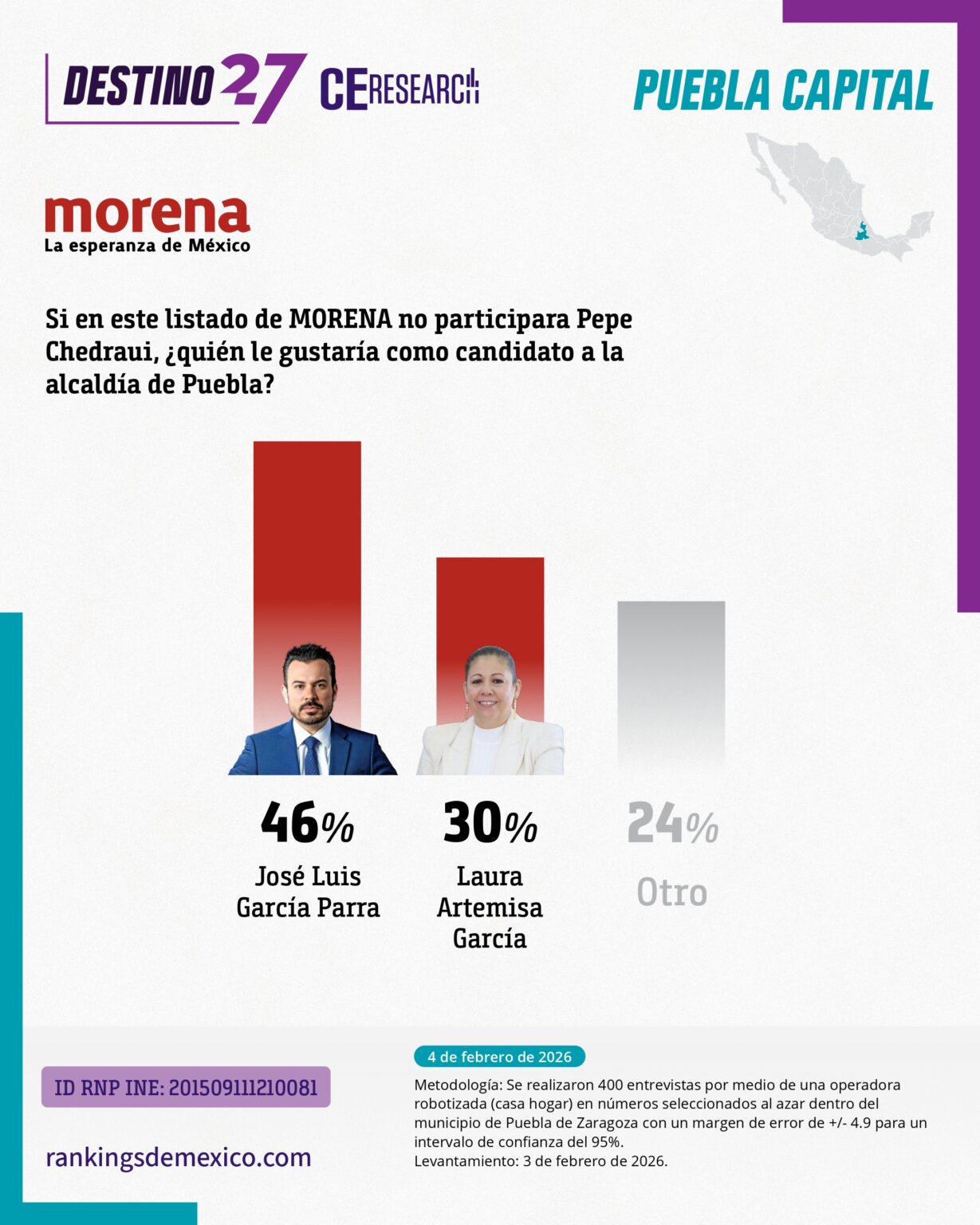 Según el sondeo realizado por Ceresearch, si la elección se llevara a cabo hoy, Chedraui obtendría el 35% de la preferencia entre los simpatizantes de Morena para ser el candidato, seguido por García Parra con el 25%. Laura Artemisa García aparece en tercer lugar con el 17%. Sin embargo, en un escenario hipotético donde Chedraui no participara, la ventaja de García Parra se amplía significativamente, captando el 46% de las preferencias, frente a un 30% de Laura Artemisa García.