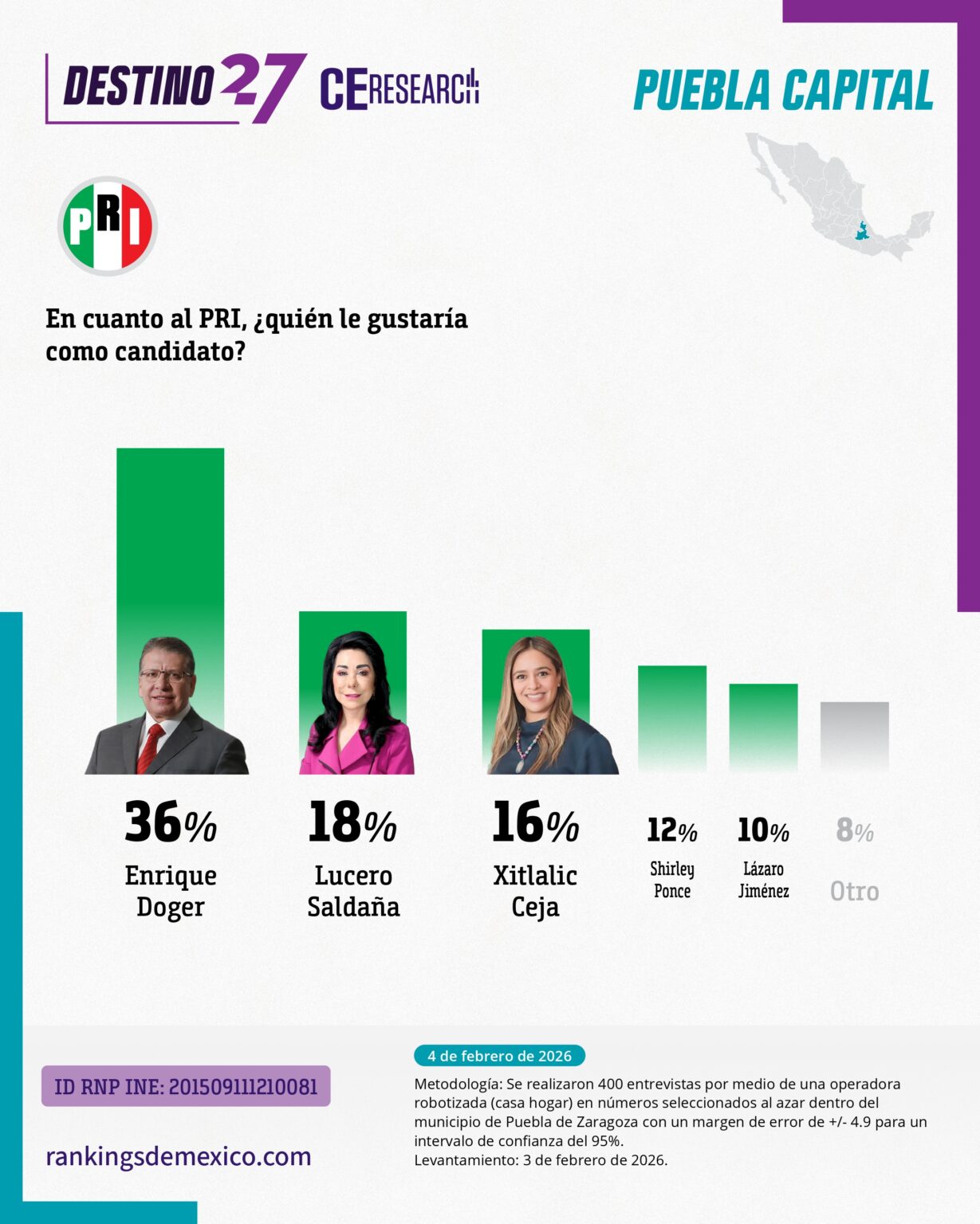 Mientras tanto, en el PAN, la pugna parece más cerrada: Mario Riestra lidera con 33%, apenas tres puntos arriba de Eduardo Rivera (30%) y por encima de Blanca Alcalá (25%). En el PRI, Enrique Doger aventaja con el 36%, seguido a distancia por Lucero Saldaña (18%) y Xitlalic Ceja (16%).
