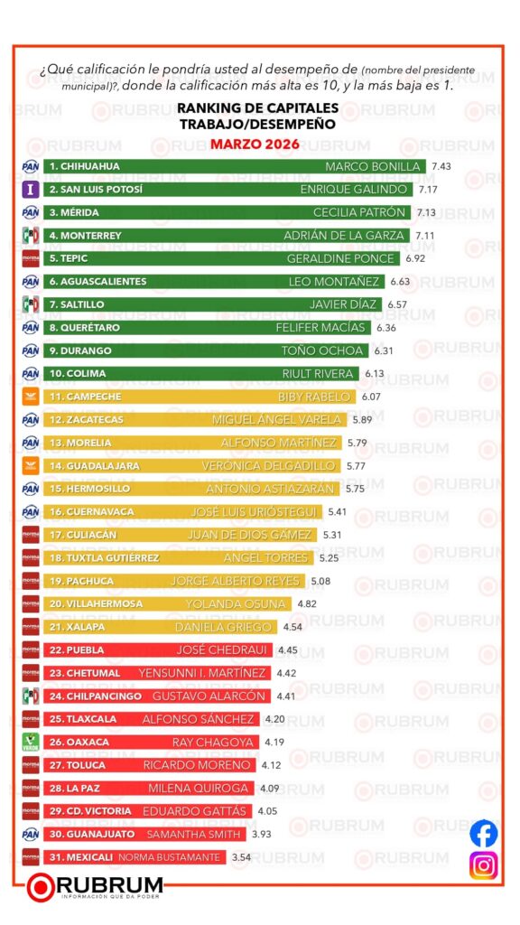 De los 31 alcaldes evaluados, el poblano aparece en la posición 24, con una calificación de 4.45. En el periodo medido —de mayo del año pasado a marzo de 2026—, su mejor registro fue de 5.20; el resto de sus evaluaciones se mantuvo en rangos cercanos al cuatro, según las gráficas del estudio.