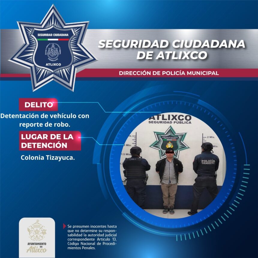 Elementos de Tránsito Municipal de la Secretaría de Seguridad Ciudadana de Atlixco aseguraron a un masculino por su probable responsabilidad en el delito de detentación de vehículo con reporte de robo, en hechos registrados en el Boulevard Doctor General Rafael Moreno Valle, colonia Tizayuca.
