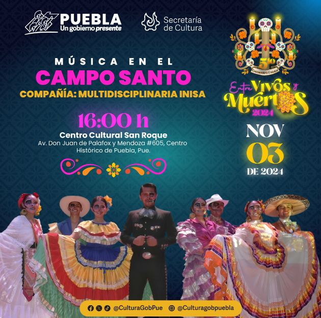 CIUDAD DE PUEBLA, Pue. – Entre las actividades del quinto Encuentro Estatal “Entre Vivos y Muertos”, desarrollado por el gobierno presente de Sergio Salomón, la Secretaría de Cultura programó actividades de teatro, música y danza que tendrán entrada libre para el público en general.