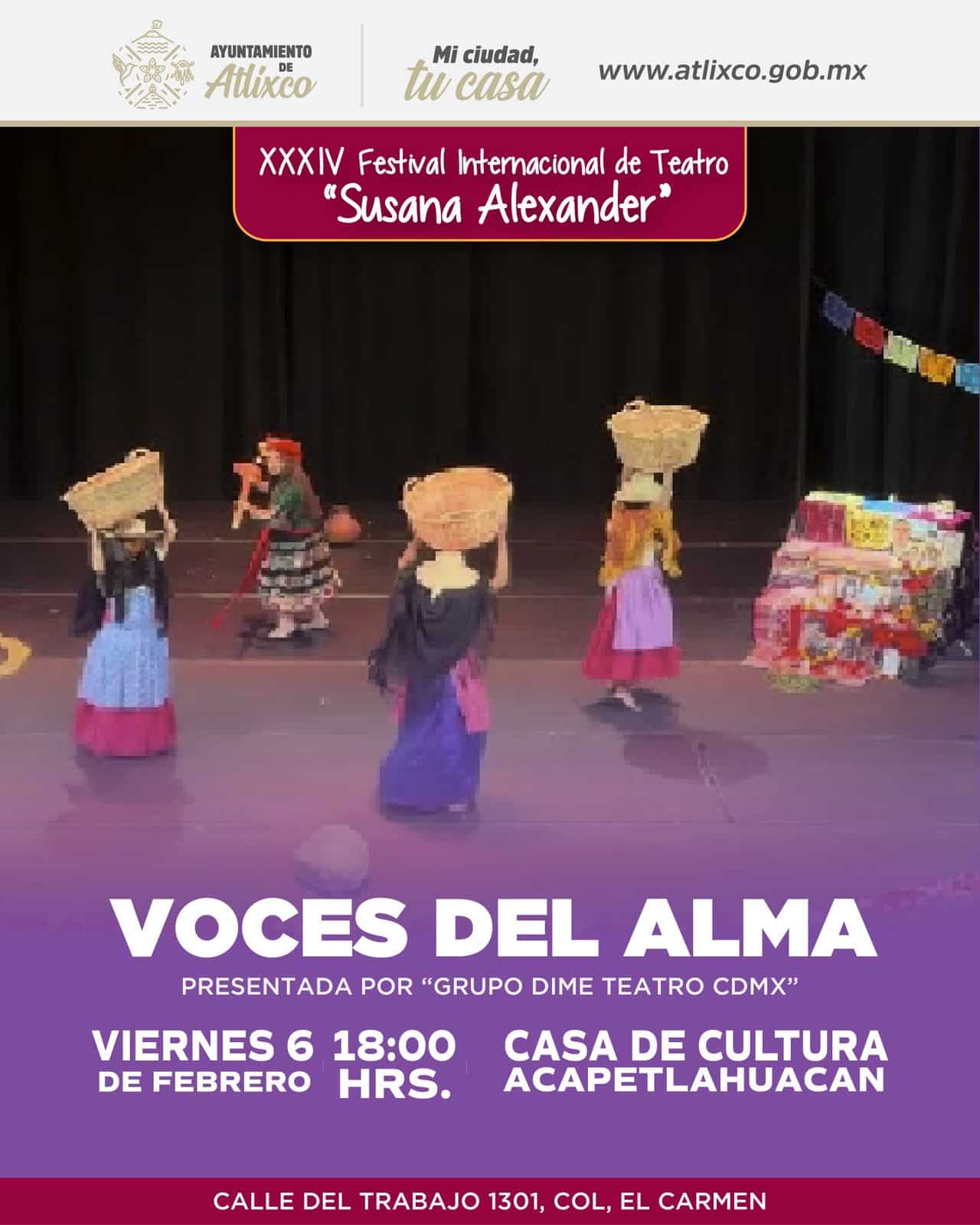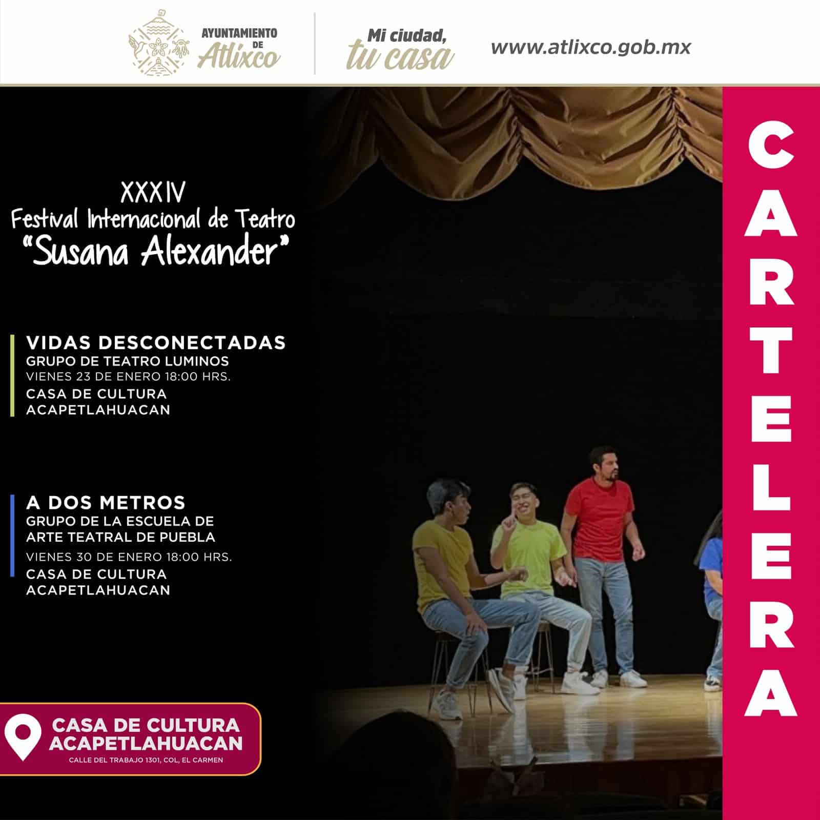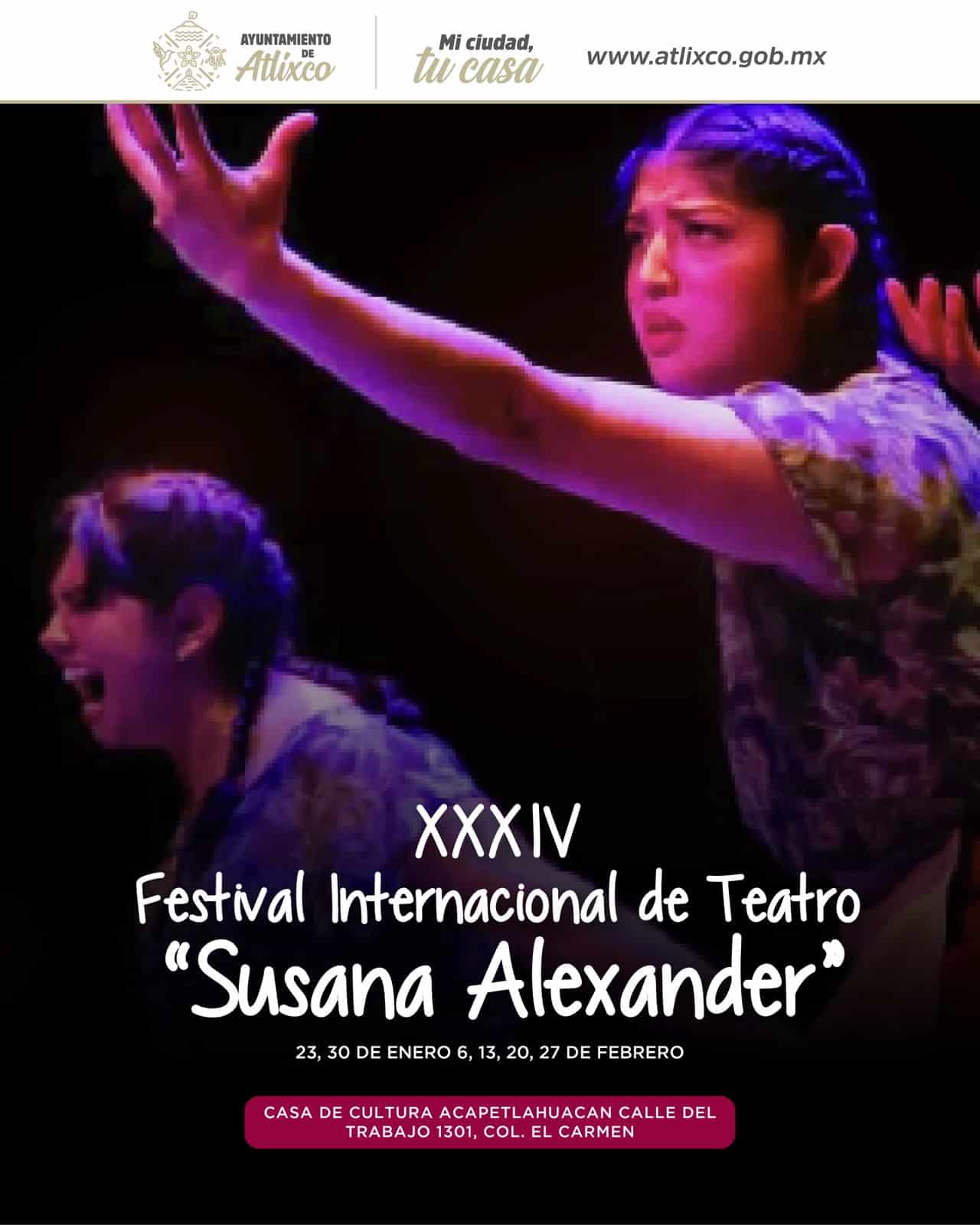 La presidenta de Atlixco, Ariadna Ayala, invita a la ciudadanía a disfrutar del XXXIV Festival Internacional de Teatro Susana Alexander, que se llevará a cabo en la Casa de Cultura Acapetlahuacan, con la participación de compañías locales y nacionales.